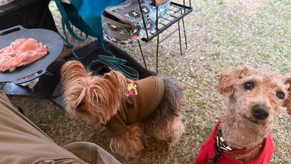 取締役で車監視役のヨークシャーテリアのららもトイプードルのゆきちも、喜んで食べています。