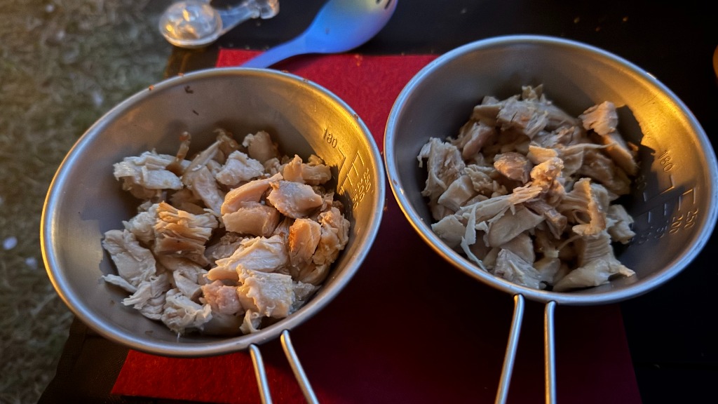 鶏もも肉を焼いてわんこ達にあたえます。2匹とも匂いに誘われてフライパンの近くにやって来ました。