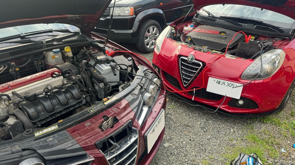 アルファロメオジュリエッタの前に車を持ってきて、バッテリーにケーブルを繋げます。