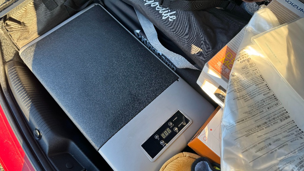 電気が取れるところが左側にあるので。 まだ、アルファロメオGTネロに荷物が積んであるので、移し替えますがアルファロメオGTネロよりも高くものが積めるので結構入りますね。